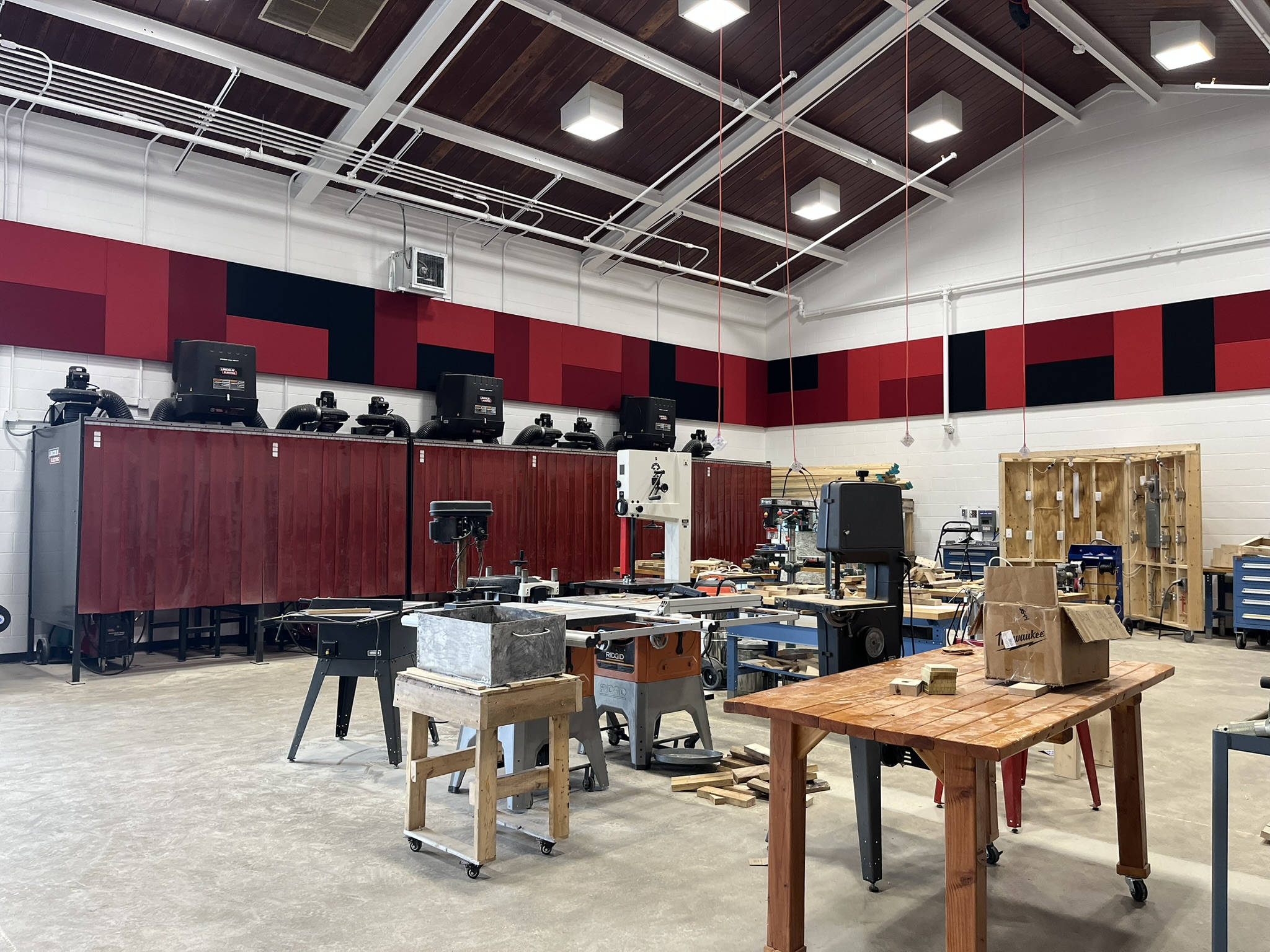 The project scope included a comprehensive reconfiguration and modernization of interior spaces. A former gymnasium was converted into dedicated welding and electrical training labs, while existing classrooms were fully updated. Two classrooms were combined to create a specialized hospitality training area.